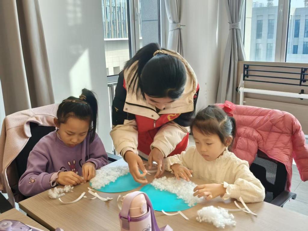 活动伊始,主讲人以生动通俗的语言,为小朋友们讲解小雪节气的由来——作为二十四节气中第二十个节气,小雪标志着气温进一步下降、降水渐增的气候转折;同时借助“冬腊风腌”“晒腊肠”“吃糍粑”等传统习俗故事传递民俗文化,让孩子们直观感受节气与生活的紧密联系。此外,主讲人还带领小朋友们品读《小雪》《小雪日戏题绝句》《夜泊荆溪》等经典诗词,深化对节气文化的认知,在朗朗书声中传递节气文化的诗意与韵味。在手工实践环节,志愿者们提前准备好画纸、颜料、棉花、彩泥等材料,耐心指导小朋友们创作雪景画。孩子们充分发挥想象力,用画笔勾勒冬日场景,以棉花点缀“雪花”,用彩泥捏制可爱雪人,现场充满欢声笑语。