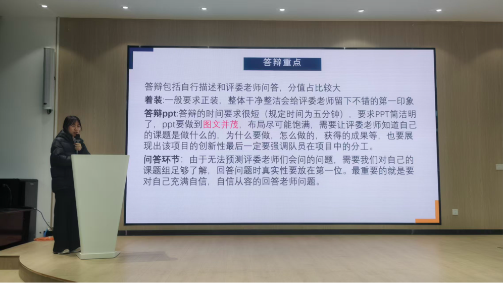 分享环节干货满满,两位主讲同学从不同维度拆解备赛关键。第一位主讲同学以“小麦淀粉积累的三问三答”为切入点,创新性呈现“选题磨成课题、答辩讲成故事、借力前辈资源”等6大核心备赛模块,系统梳理了科研成果向创业项目转化的可行路径;第二位主讲同学则聚焦赛事全流程实操,围绕项目落地逻辑、备赛细节把控、材料优化技巧等内容展开深入讲解,为同学们提供了清晰的行动指南。现场氛围热烈,同学们专注记录核心要点,针对“专业方向与赛事项目对接”“备赛时间规划”等关键问题积极提问,主讲人逐一细致解答,有效解决了大家的备赛困惑。