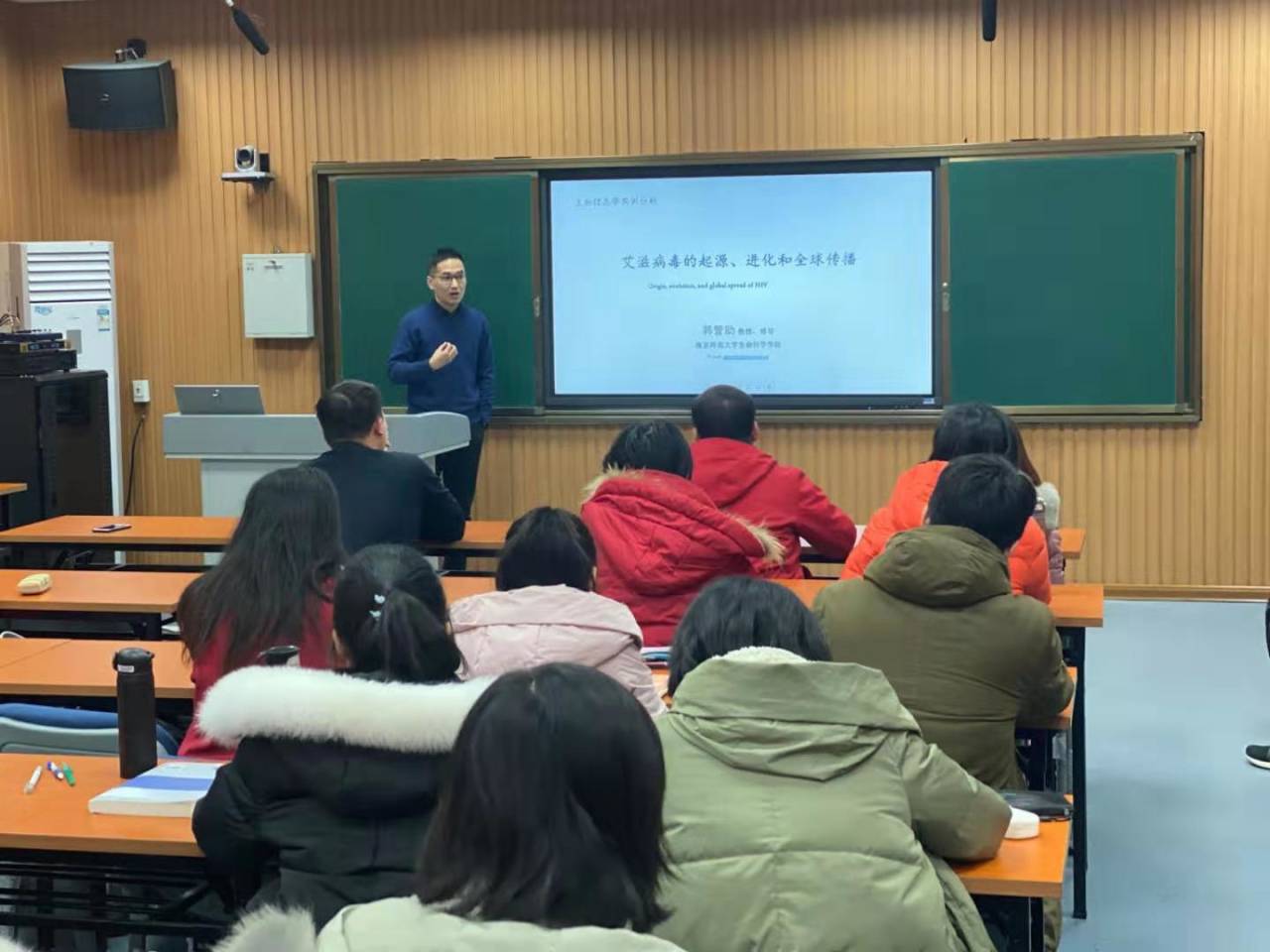 韩管助教授作题为《生物信息学分析实例:艾滋病毒的起源、进化和全球传播》的学术报告,报告围绕艾滋病毒的类型、传播方式、系统发育分析以及全球分布情况展开。孙亮副研究员作题为《生物信息学在科研与现实应用中的作用》的学术报告,报告围绕生物信息学的研究内容、生物信息学与生命多组学、生命多组学研究推动医学科研的发展以及生物信息学的未来应用前景和场景等方面展开。徐松副研究员作题为《生物信息学在微生物生态环境中的发展和应用研究》的学术报告,报告围绕生物信息学在微生物研究的应用、极端环境微生物的研究内容等方面展开。报告结束后,三位专家与老师和同学们进行了热烈的学术讨论,并对ok138cn太阳集团古天乐、山东省功能性生物资源开发与利用高校重点实验室发展给出了指导性意见和建议,对推动ok138cn太阳集团古天乐人才培养和高校重点实验室的发展,发挥积极的作用。