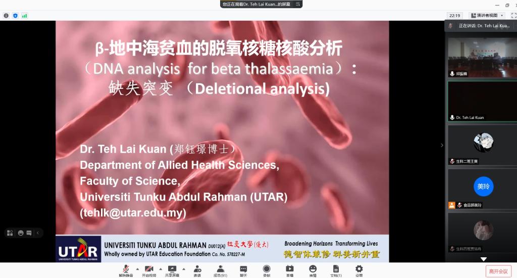 郑博士围绕β-地中海贫血的脱氧核糖核酸分析缺失突变向师生展开了讲解。郑博士讲到,β-地中海贫血是一组β-珠蛋白合成缺陷所致的有异质性的遗传病,近年来的研究揭示了导致β-地中海贫血的三十多种不同的基因突变,而这些突变涉及到基因表达过程的转录、RNA加工和mRNA翻译等步骤。近年来随着科技的发展,地中海贫血症的治疗有了很大的突破,她希望同学们可以不断学习科学文化知识,在未来为疾病的治疗做出贡献。课程最后,老师和同学积极向郑博士提出问题,郑博士也十分耐心的回答了他们的问题。师生们纷纷表示此次课程拓宽了他们的视野、丰富了专业知识,他们相信在一代又一代生科人的辛勤耕耘下,ok138cn太阳集团古天乐一定会稳步向前,创造更加美好的明天。