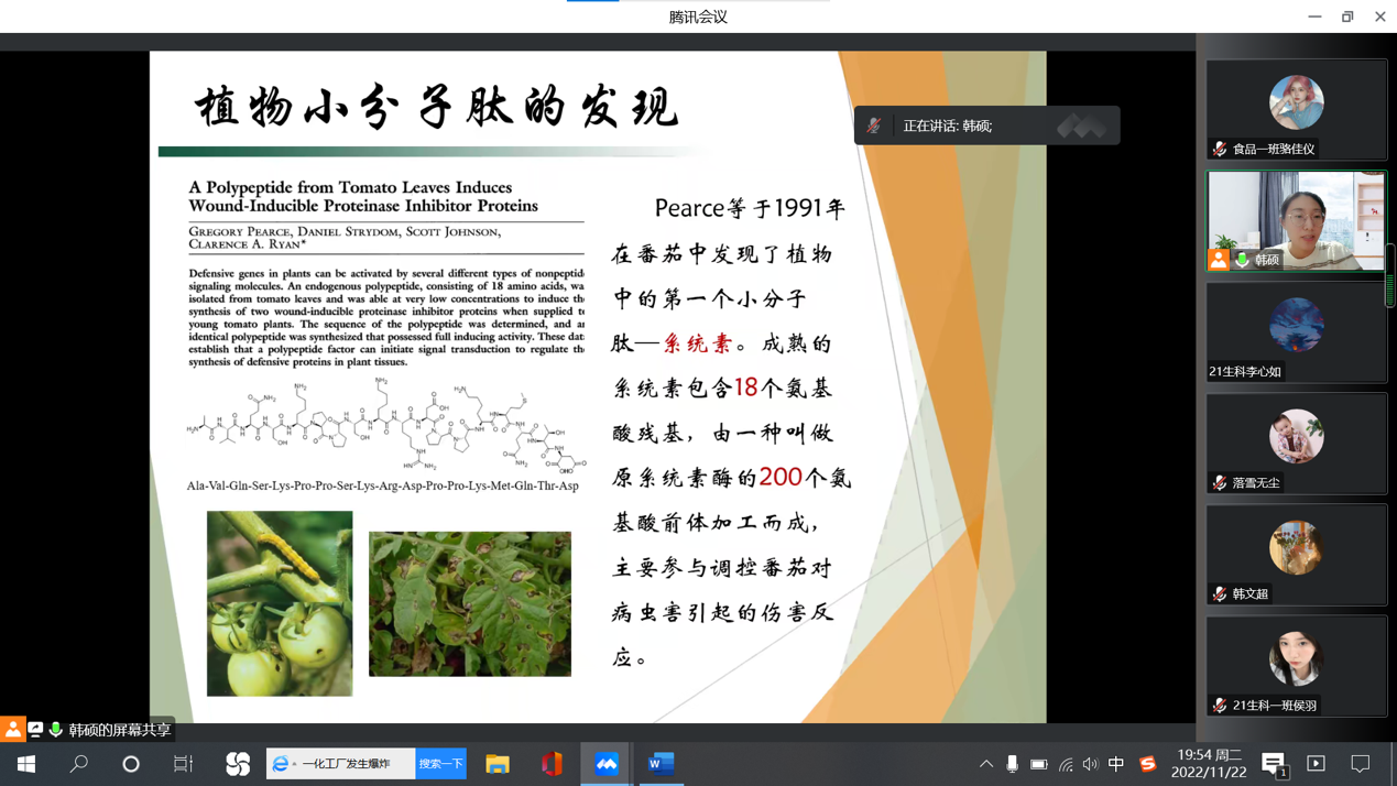 11月22日,为了进一步拓宽青少年眼界,弘扬科学精神,ok138cn太阳集团古天乐通过腾讯会议举办线上“小分子蛋白——多肽在植物中的功能与研究”专业前沿知识讲座。