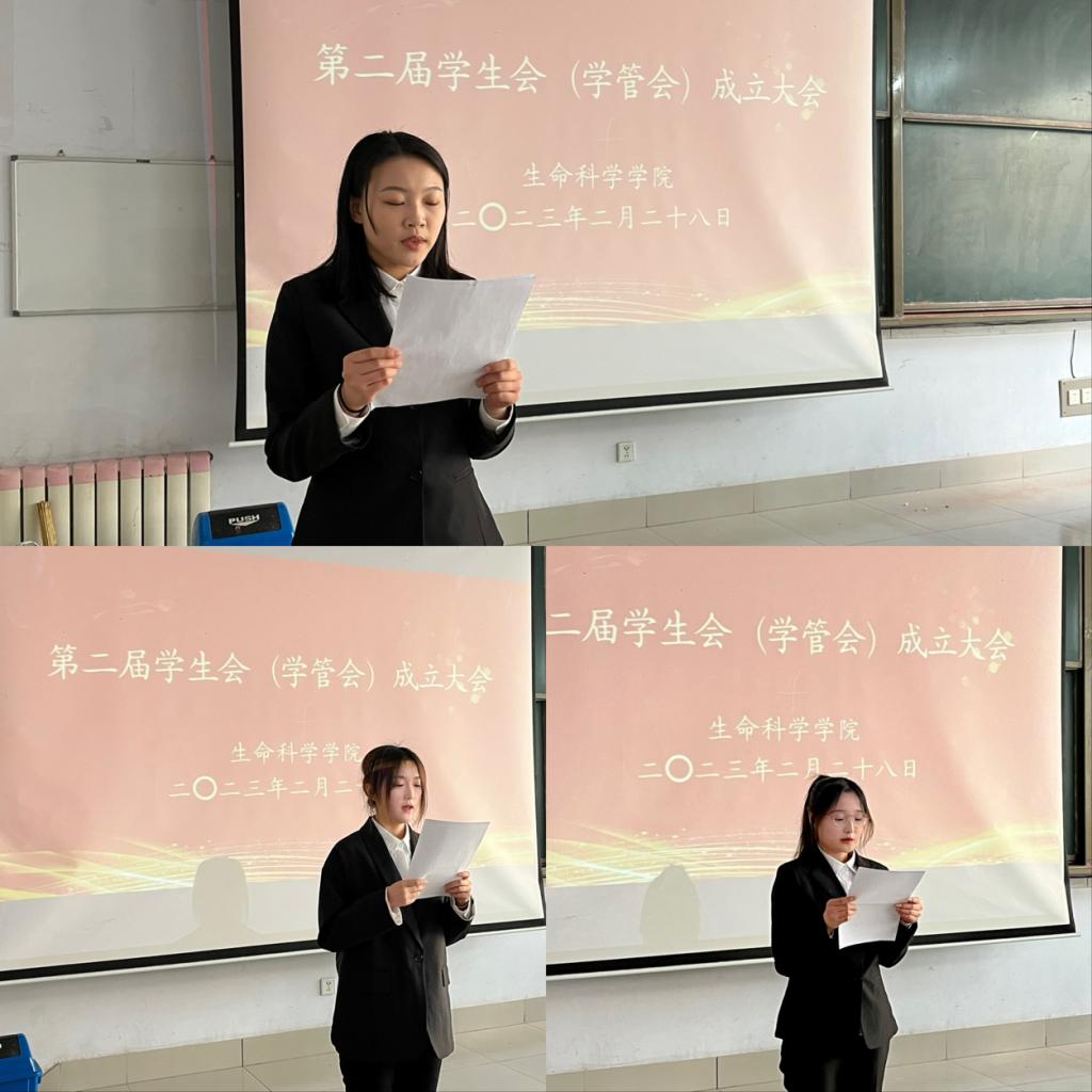 会上,学生会主席李梓萌同学宣读了第二届学生会成员名单。部长代表和新生代表霍春慧、孙悦同学做表态发言,她们激励大家要以服务全院师生为宗旨,用最饱满的热情迎接挑战,随后,辅导员老师们依次发言表示同学们要做到“学、拧、主、序”,形成“传、帮、带”的良好局面,树立全心全意为同学服务的意识,培养奉献精神和团结协作精神,做好新学期工作规划,遵守学校规章制度,充分发挥骨干模范带头作用,为营造良好的校园文化氛围贡献力量。夏书记做出总结性发言,她对学生会的工作给予充分肯定,并对下一步工作提出了四点要求:一是全体学生干部要明确工作性质,提高工作能力与服务水平;二是要严以律己,宽以待人,恪守学生本分,做有礼貌、有纪律的学生干部;三是积极配合学院工作,谋求成长资源,珍惜发展平台,不断提升自身价值;四是在学院领导下,以不甘落后的精神打造具有强大战斗力的先锋队伍,在新的一年里继续创造辉煌。最后,全体学生会成员依据学生会干部自律公约倡议书内容进行宣誓。