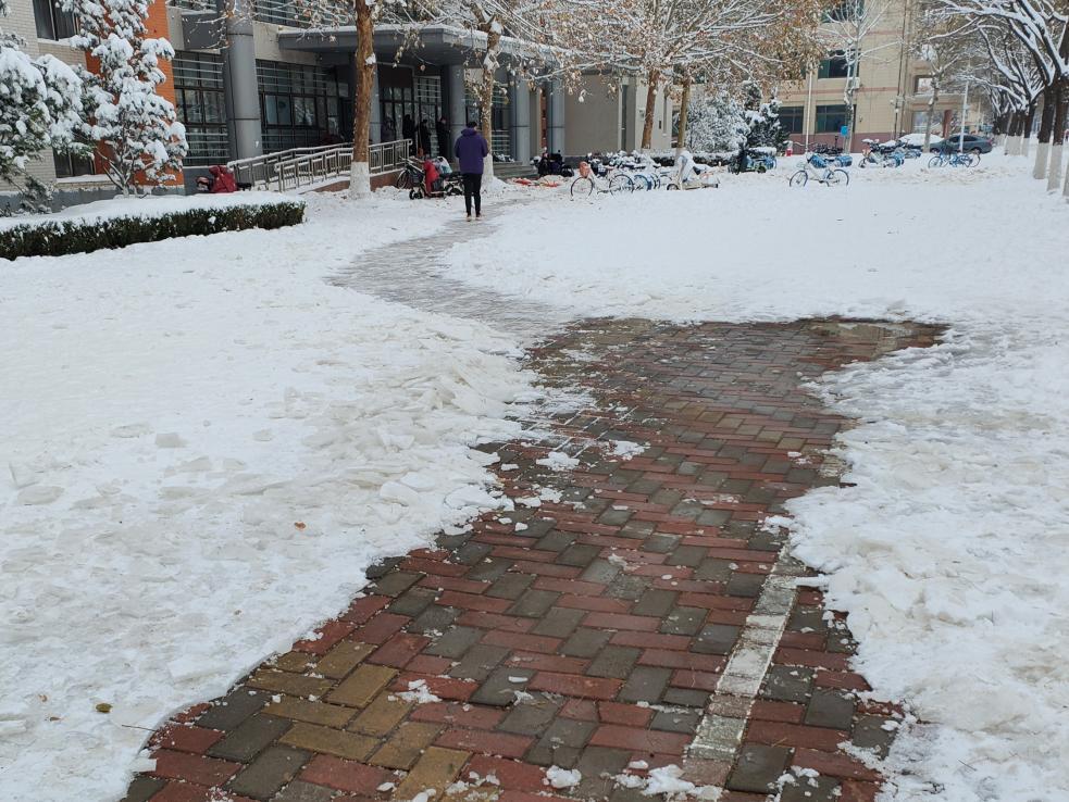 除雪现场,志愿者们不畏严寒、团结协作,手持铁锹、除雪铲等工具,针对求实楼联通女生宿舍楼的主干道等积雪较多、路面湿滑的区域,按照预定的计划和步骤有条不紊地开展扫雪除冰工作,并叮嘱来往的同学雪天路滑,出行时要注意安全。经过紧张有序的劳动,该区域的道路积雪得到了有效清除,保障了同学们的出行安全,为文明安全校园贡献了青春力量。