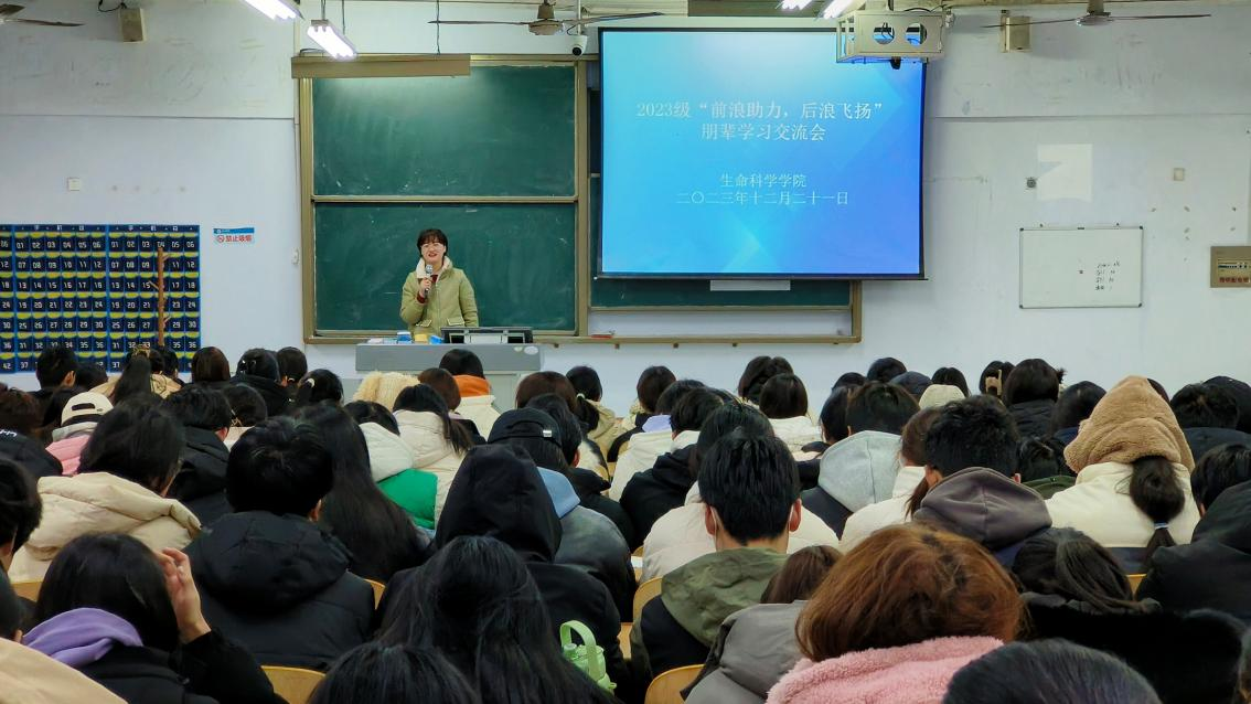 12月21日晚,ok138cn太阳集团古天乐于求实楼0117教室举办“前浪助力,后浪飞扬”朋辈学习交流会,此次会议邀请了22级生科二班孙悦、生科一班李萌、食品班宋欣、生科二班张尔迪,23级全体学生参加会议。23级辅导员孙珍辉主持。