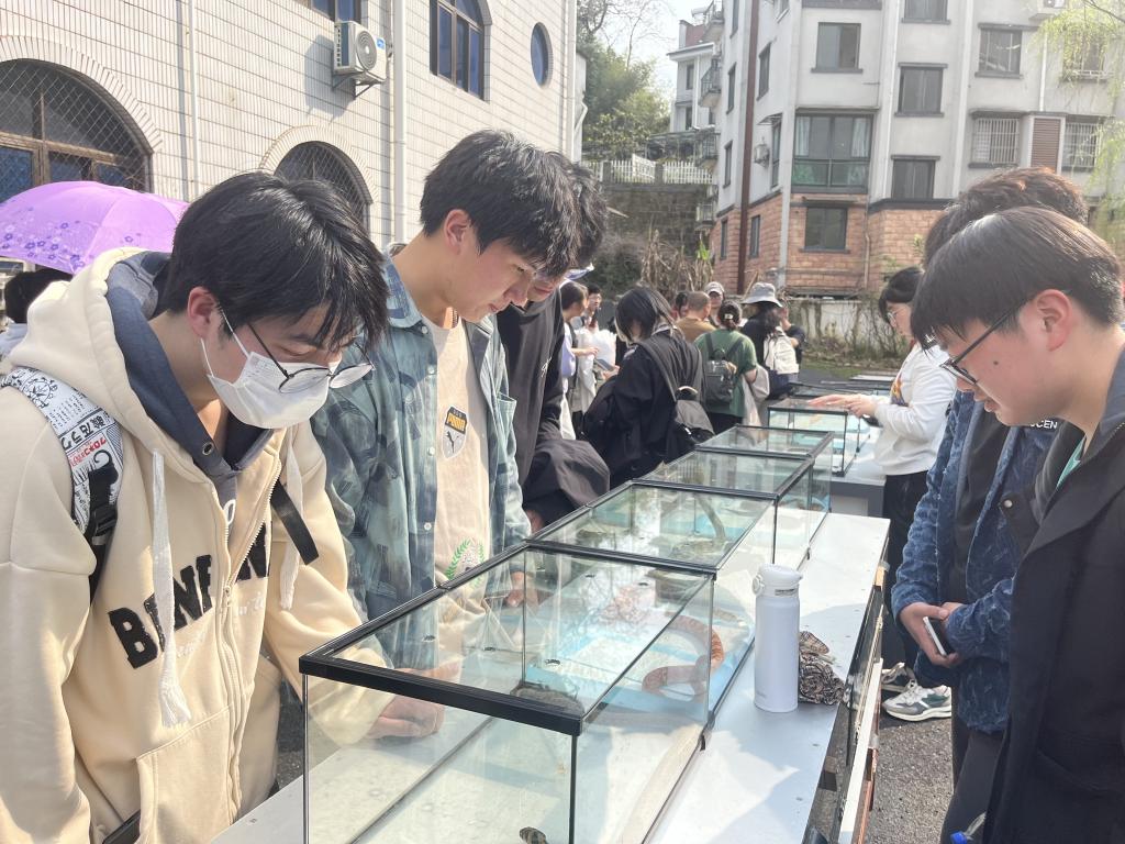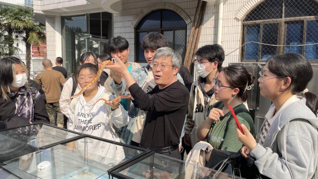 在宏村,学院老师详细讲解了采集标本的方法和注意事项,并准备了必要的采集工具和安全装备。随后,同学们以严谨的态度,认真观察记录下植物的名称、特征和科属等知识,小心采摘植物样本,捕捉昆虫和小型动物,老师对操作进行细致指导和点评,确保采集过程的科学与安全。下午,师生一行前往屯溪蛇园参观学习。在讲解员的带领下,共同参观了蛇园的繁育区、展示区和科研区,通过讲解,大家了解到蛇类对于维持生态平衡具有重要意义。此外,在参观过程中,学生们还亲手触摸了一些温顺的蛇类,从而更加直观地了解蛇类的特点与习性。