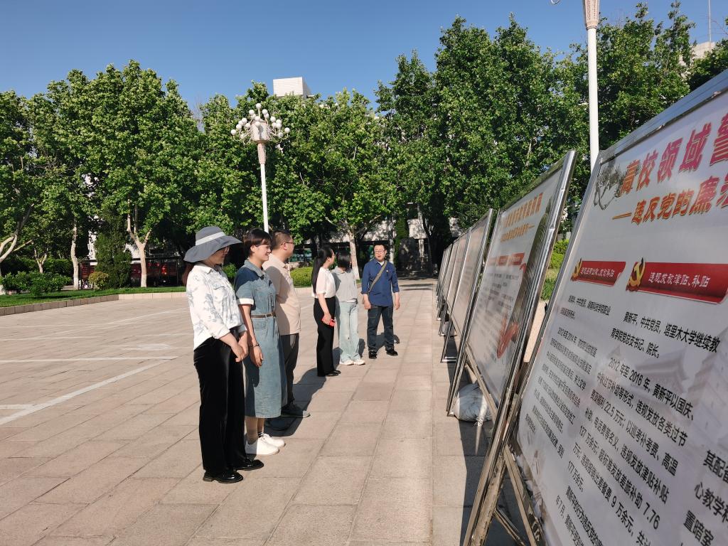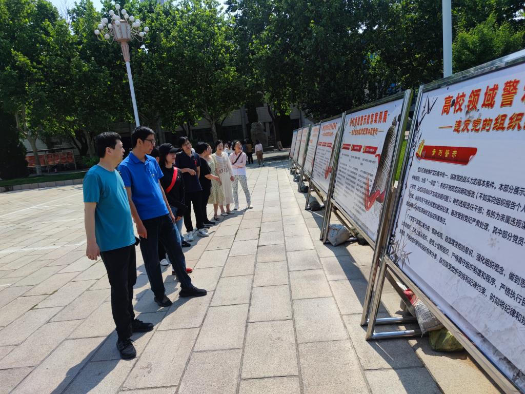 5月30日,为深入推进党纪学习教育,引导党员干部学纪、知纪、明纪、守纪,ok138cn太阳集团古天乐在厚德楼南侧广场组织全体非处级党员教师参观了“以案明纪,警钟长鸣”高校领域警示教育案例展。