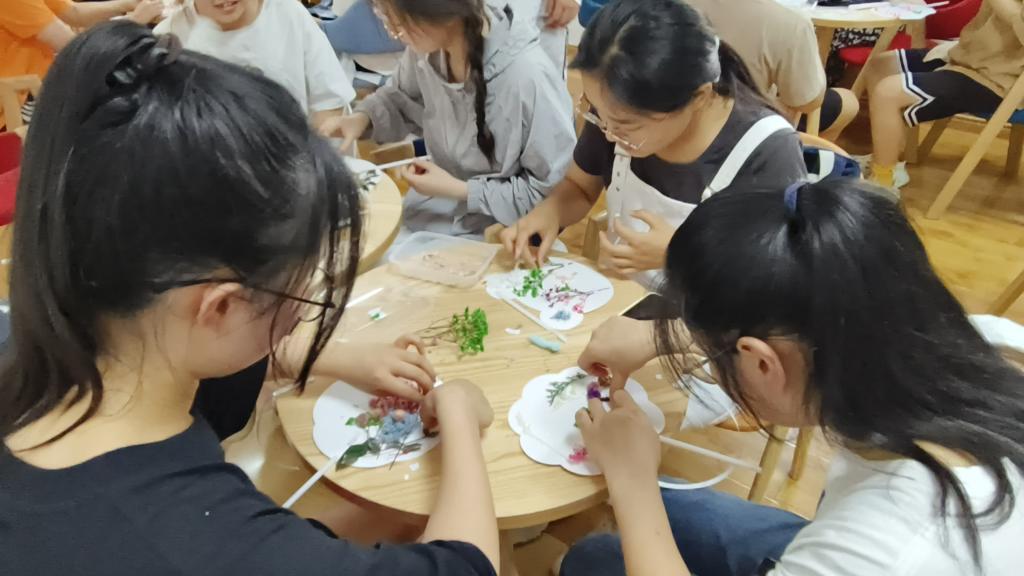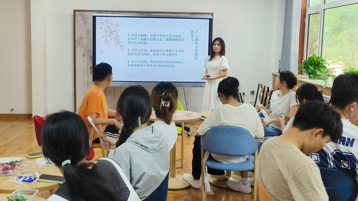 活动中,主持人介绍了团扇的起源、发展历史以及团扇的文化内涵,带领同学们深入认识干花团扇,并详细讲解了干花团扇的保养方法和具体的制作步骤,确保每位同学都能领会并掌握。紧接着,志愿者为同学们分发了干花、团扇、胶带等材料,他们充分发挥创造力,认真勾勒、巧妙布局,用干花和绿叶将空白团扇装饰成一件件栩栩如生、独一无二的作品。