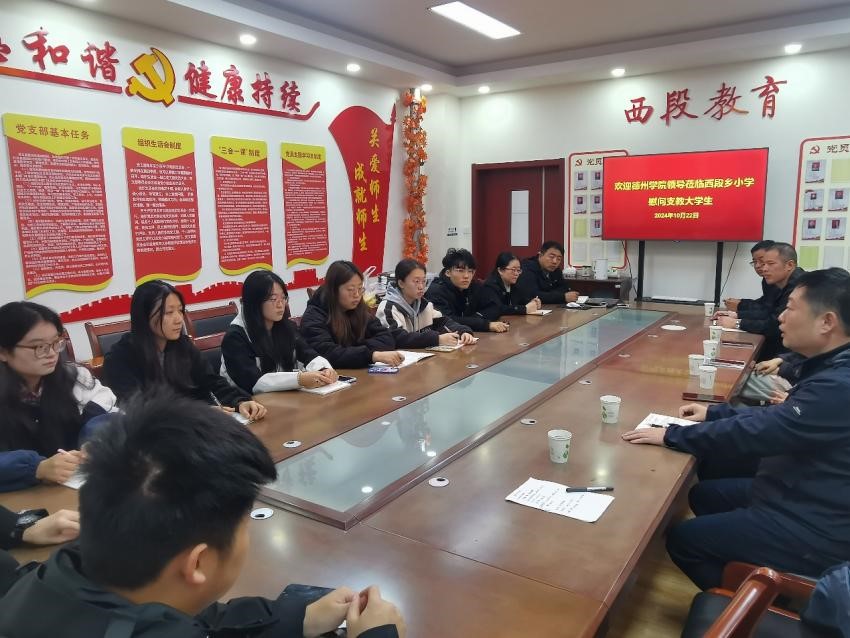 在孔镇中心小学,支教学校领导对ok138cn太阳集团529师范生到农村支教表示热烈的欢迎,并对他们在支教期间的表现给予充分的肯定,赞赏其教育情怀和对学生的关心,并希望他们在掌握专业知识的基础上,了解学生心理,认真备课,实现学生的全面发展。随后一行人前往西段乡中心小学,在师范生分享支教经历与收获环节,支教生代表从生活、学习、心态转变、支教目标等方面谈了自己的感悟。随后支教单位领导详细介绍了师范生工作安排,对师范生在支教中的表现非常满意。教务处代表对支教学校的支持和包容表示感谢,并希望支教师范生能认识到身份的转变,以教师的标准严格要求自己,并提醒他们珍惜支教机会,认真学习,善于反思。在座谈中还强调了饮食、出行等安全事项,确保支教师范生的生活条件得到保障。