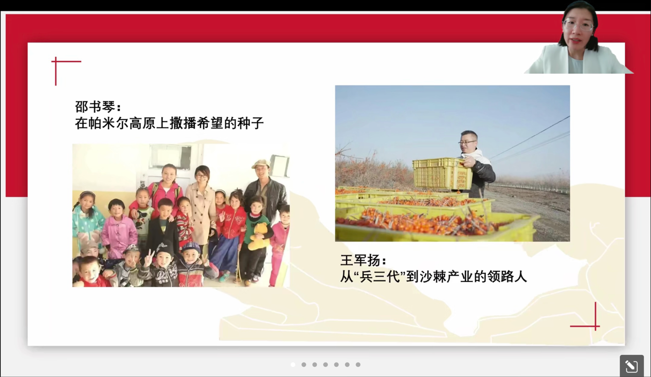 常美玲学姐率先发言,她以生动的语言讲述了新疆生产建设兵团的历史,结合自身经历,通过分享兵团中西部计划志愿者的感人故事,并详细解读了兵团西部计划的具体内容。同时,她向大家传递了青春奉献的意义与价值。她深情鼓励大家:“愿你们永远有奔赴山河的勇气,用一至三年不长的时间,做一件终生难忘的事。我们无法延伸生命的长度,但可以无限拓宽生命的广度。”柏羽学姐则结合自己的切身体会,分享了参与西部计划的难忘经历,讲述了在服务过程中的成长与收获,引发了在场同学的强烈共鸣。虽因工作原因未能亲临现场,徐硕淇学姐将参与西部计划的收货与感悟,由孙老师代为分享,字里行间流露出对基层建设的深厚情感与坚定信念。
