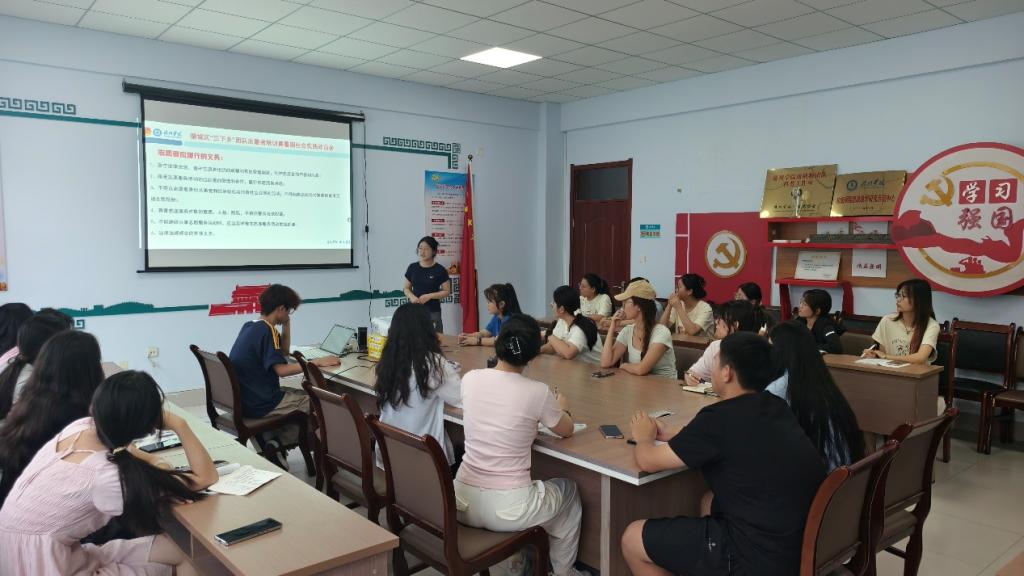 会议伊始,团队负责人郭永珍带领全体参训志愿者围绕“志愿者的定义、义务与权利”展开培训,强调志愿者应秉持“奉献、友爱、互助、进步”的精神,在服务中严守纪律、展现责任担当,同时在服务基层的同时注重自身品格的锤炼,真正做到知行合一。随后,马双老师详细解读了本次“三下乡”的任务安排,包括教育帮扶、文化宣传等内容,并针对安全预案、团队协作等提出具体要求。最后,全体志愿者进行庄严宣誓,铿锵有力的誓言彰显了他们服务乡村、奉献社会的坚定决心。会议现场气氛热烈,纷纷表示将认真践行志愿者精神,以饱满的热情投入到即将到来的暑期社会实践活动中。