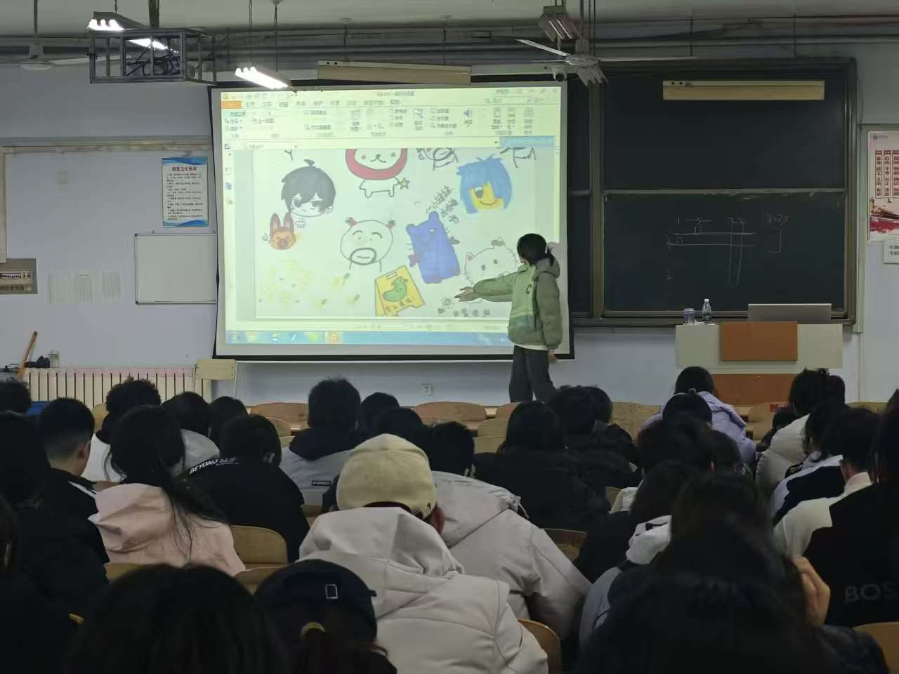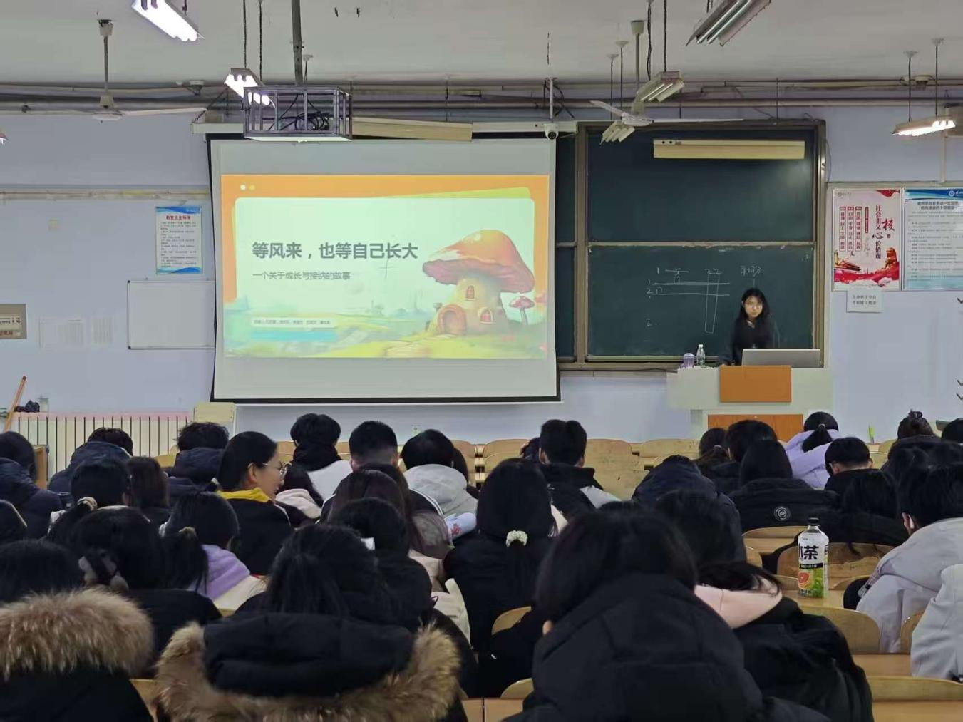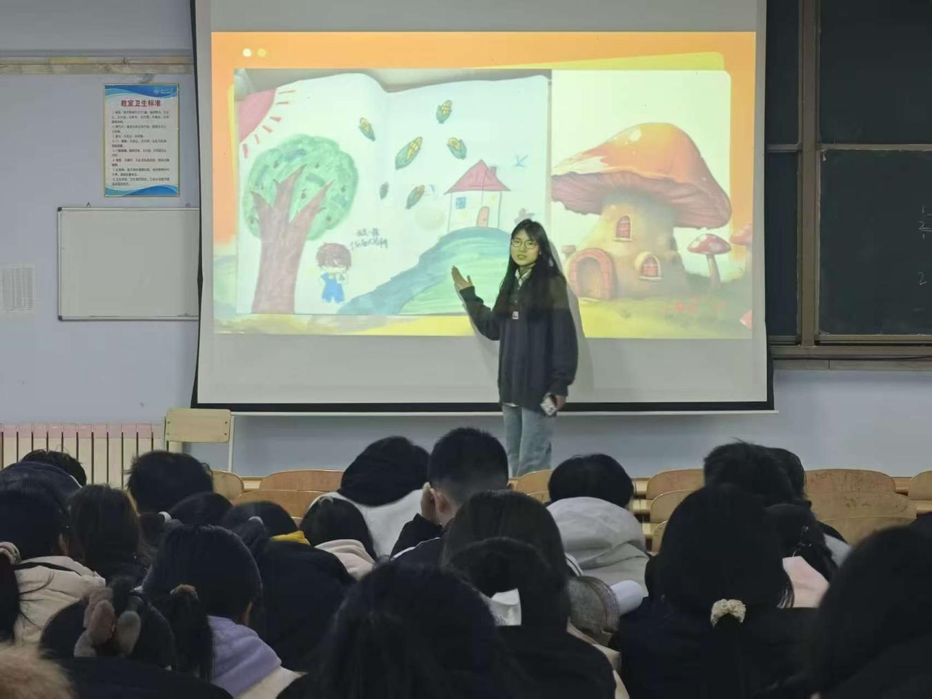 在活动前期,各组成员充分发挥想象力依次作画,期间规定不可以商量要画什么,合力完成一幅画。在画的过程中,每位同学感受着当下的情绪与想法,或是温暖治愈的色彩搭配,或是象征童年时稚嫩笔触的意象,又或是成长后富有深意的画面构图,每一笔都透露着对心理健康的理解。活动进行理念分享环节,各小组代表依次上台,结合画作内容详细阐述每位成员创作理念。各组同学的分享真挚而深刻,引发了现场观众的强烈共鸣。台下同学认真聆听、积极互动,最后围绕画作中的心理表达展开交流,进一步加深了对心理健康的认知,也感受到了小组协作带来的归属感与成就感。