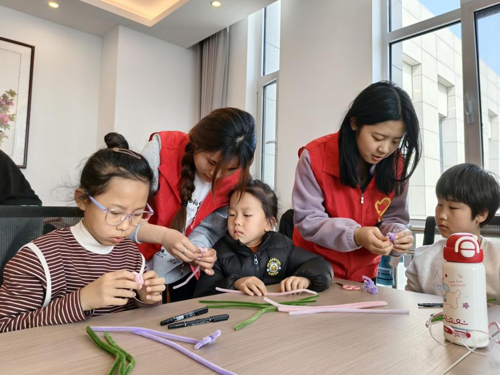 活动伊始,志愿者以春日主题短片为引,为孩子们讲解春日万物复苏的鲜明特点,趣味科普春困原因、植物开花的小奥秘,并且通过互动提问引导大家寻找“身边的春天”,激发了孩子们的自然探索兴趣。随后,志愿者展示春日花卉的实物与图片,细致讲解其形态特色,让孩子们近距离感受自然之美。手工创作环节,我院学生党员充分发挥先锋模范带头作用,与志愿者分工协作,为孩子们分发手工材料,手把手耐心示范花瓣弯折固定、花束捆绑调整的小技巧。孩子们化身小小创作家,捏制出形态各异的春日花朵,现场欢声笑语不断,孩子们专注创作的模样,成为春日里一道温暖的风景。