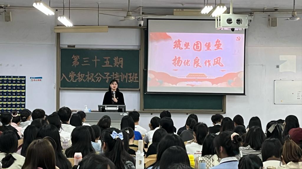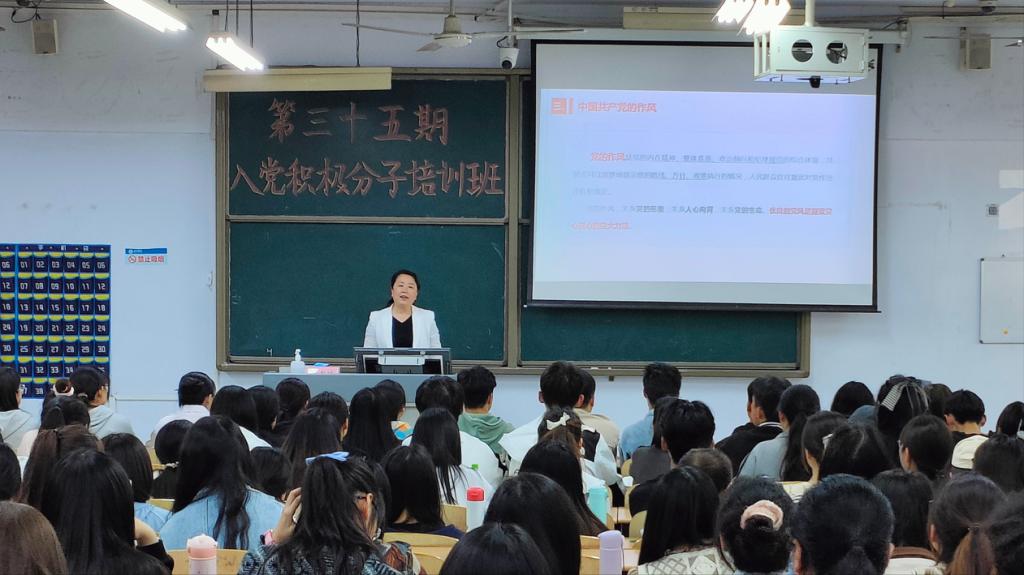 2023年4月18日,为帮助入党积极分子进一步掌握党的知识,保持党组织的先进性和纯洁性,ok138cn太阳集团古天乐党委副书记夏书珍、第三学生党支部书记孙珍辉同志于求实楼0117教室作“筑坚固堡垒,扬优良作风”主题党课讲座。参训学员共127名。