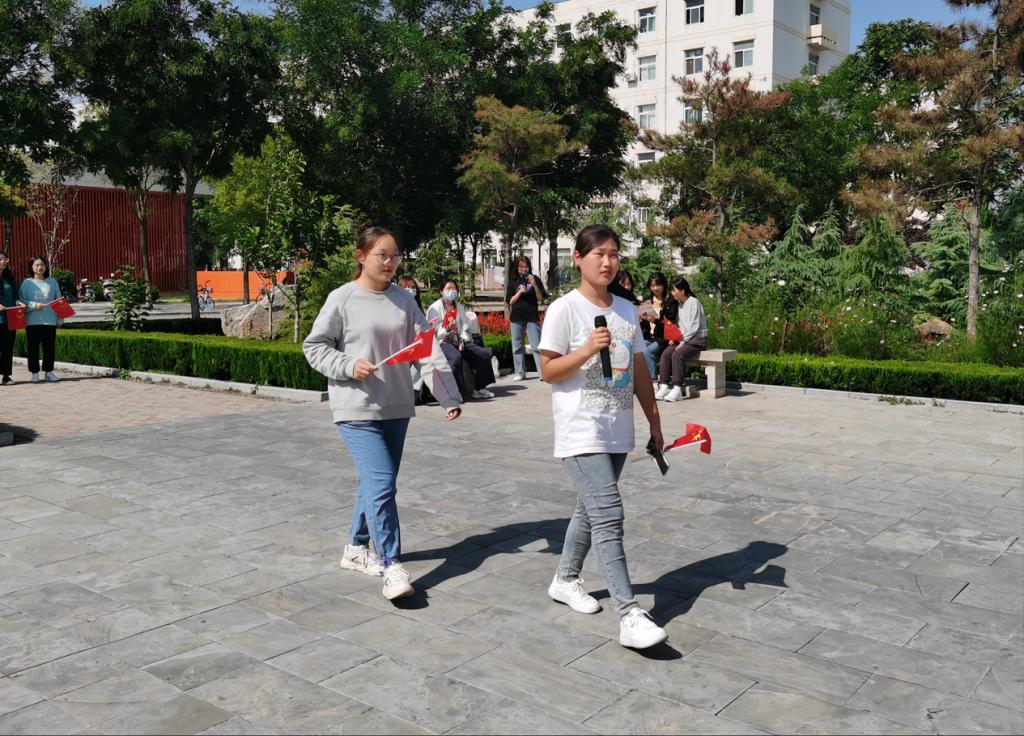 同学们聚在一起,用快闪的形式,共同唱响《我和我的祖国》,他们热情饱满、斗志昂扬,挥舞着五星红旗,配和着优美的旋律,歌声分外嘹亮。一首红歌就是一段岁月,慷慨激昂的歌声表达着莘莘学子的豪情,也燃起了他们心中的爱国情怀,经典的红歌唱出了对祖国的热爱与忠诚,使同学们铭记祖国的峥嵘岁月与辉煌成就,展现了他们奋发向上的精神风貌。