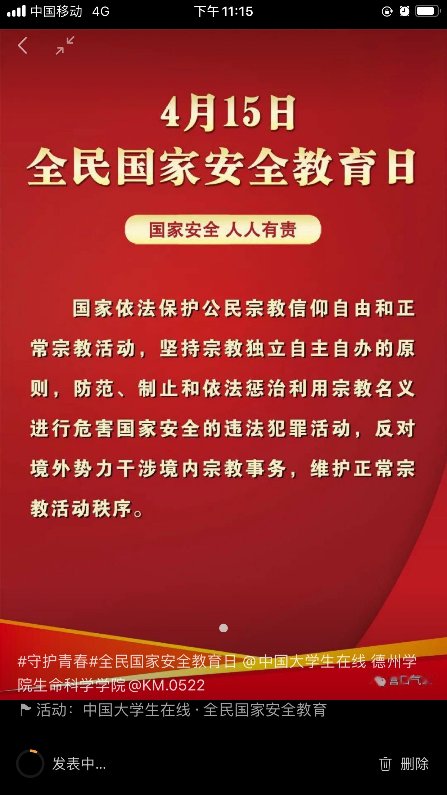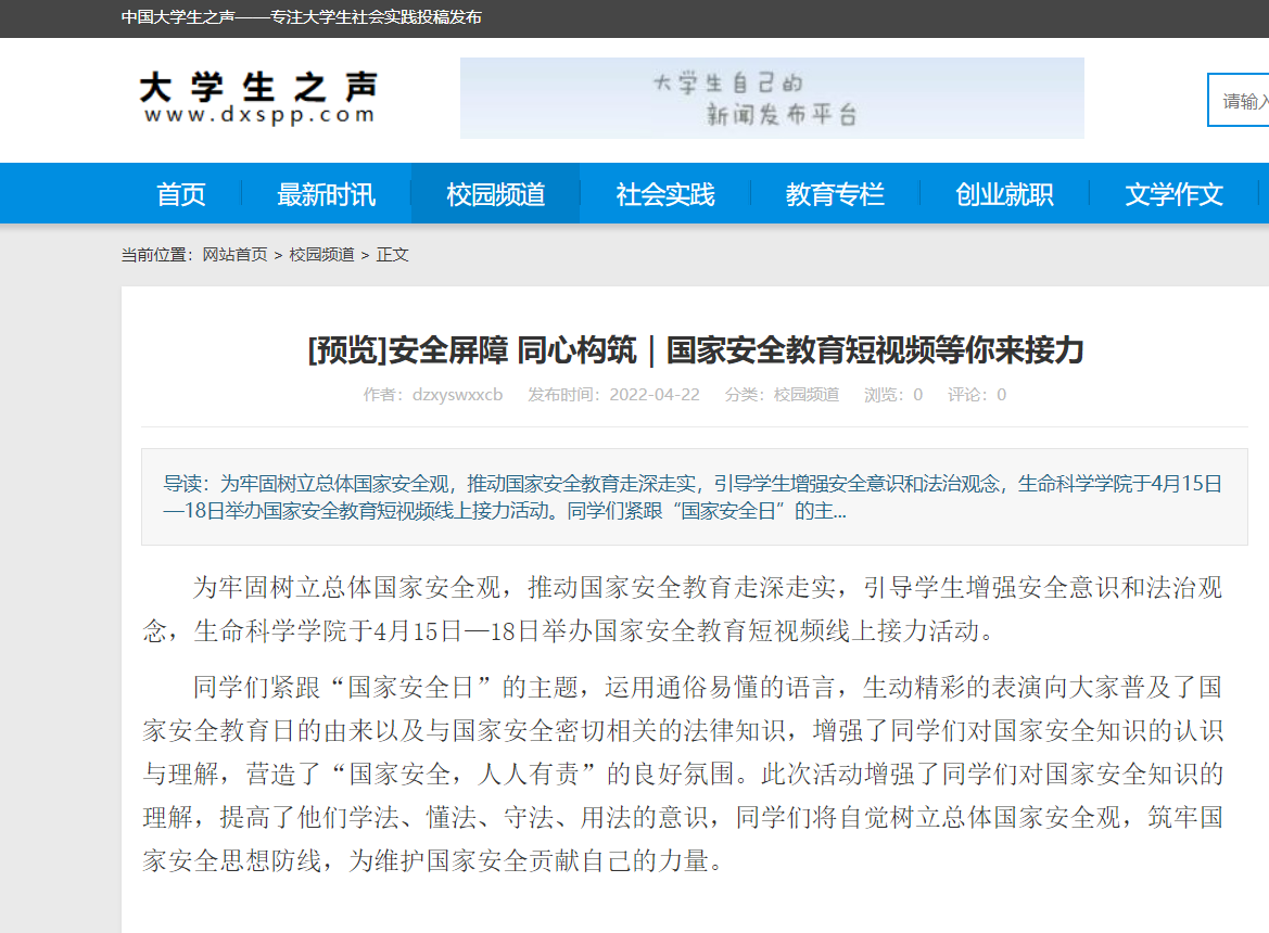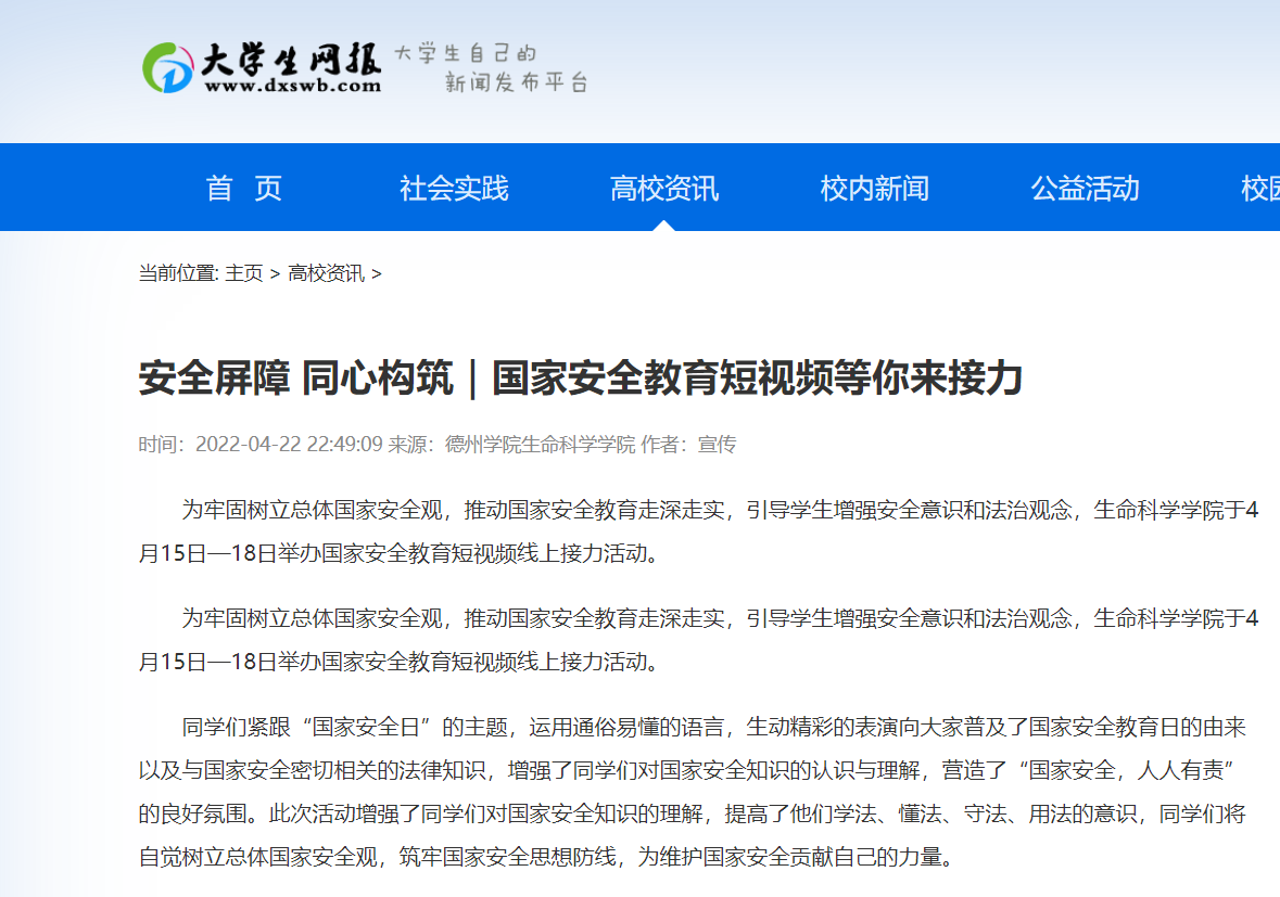 为牢固树立总体国家安全观,推动国家安全教育走深走实,引导学生增强安全意识和法治观念,ok138cn太阳集团古天乐于4月15日—18日举办国家安全教育短视频线上接力活动。