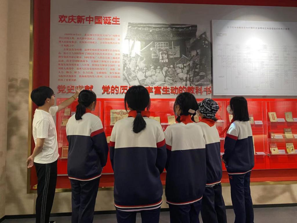 志愿者们带领淄博市张店区第八中学的学生代表来到红色淄博—淄博市博物馆馆藏革命文物展,并以时间为主线,通过197件文物、160幅图片和其他宝贵资料,向学生讲述了淄博人民在中国共产党的领导下前赴后继、英勇斗争的光辉历史。随后,志愿者们分别前往社区,利用“党史学习教育”主题宣传展板和宣传手册,紧紧围绕文化传承、科技创新等内容,从不同历史阶段讲述中国共产党人在奋斗中的典型故事和感人事迹,引导社区群众正确认识学党史的重要意义,让大家对开展党史学习教育,牢记初心使命有了更加深刻的理解和认识。