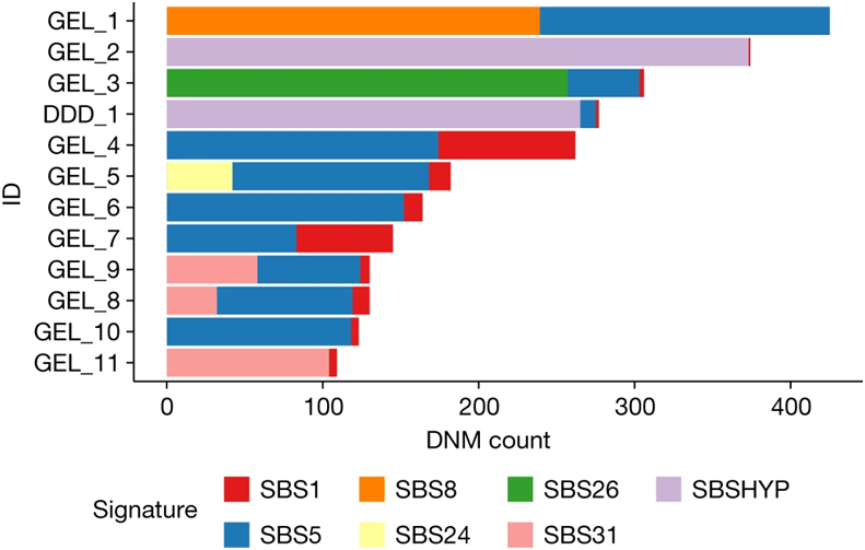 其中有8名儿童这种的高突变可能与他们父亲的精子有关。这些作者可以对其中的7个家庭进行详细调查,在这些家庭中,儿童的过度突变来自于其生父。其中的两个父亲携带了罕见的损害DNA修复机制的隐性基因突变。