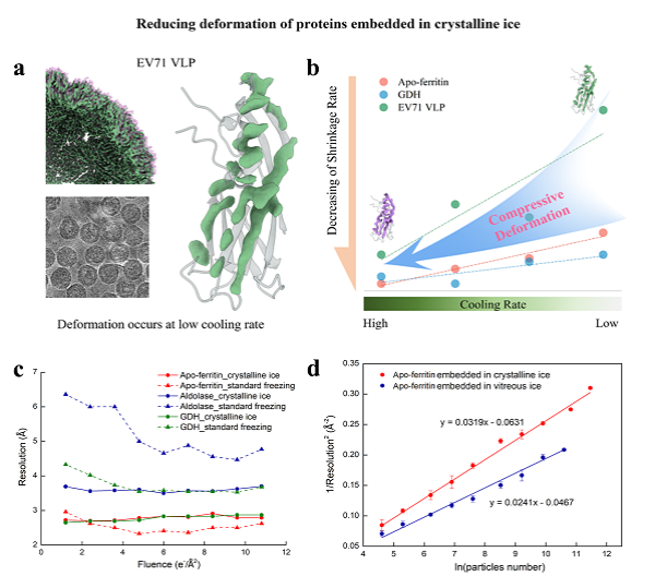 大量实验数据证明,低降温速率制备的冷冻电镜样品有助于恢复数据采集时样品的束诱导漂移,但降温速率过低经常导致晶态冰的形成。传统认为晶态冰在生物样品冷冻过程中会对其结构造成破坏,故在冷冻电镜样品制备过程中一直避免使用。晶态冰的形成具体对蛋白质产生了什么破坏尚不清楚。