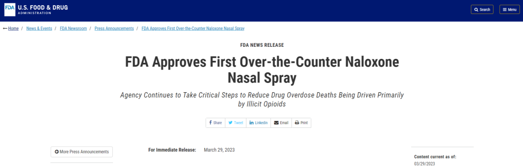 该公司新闻稿显示,Narcan此次获批可能会影响到其他品牌纳洛酮鼻喷雾剂产品(4mg或以下规格),FDA可能会根据具体情况联系相关公司。