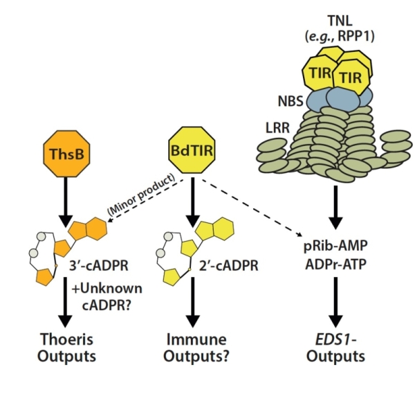 细菌对抗病毒的Thoeris免疫系统由两个蛋白构成,ThsB和ThsA,其中ThsB含有TIR结构域。噬菌体侵染激活细菌ThsB较弱的NAD+降解酶活性,产生未知的信号分子激活下游ThsA的高NAD+降解酶活性,并导致胞内NAD+耗竭和细胞死亡。ThsB较弱的NAD+降解酶活性只有在被噬菌体激活后才会体现,且纯化的ThsB蛋白在体外检测不到酶活。已知植物Bd-TIR也能激活ThsA,但ThsB和Bd激活ThsA的信号分子未知。