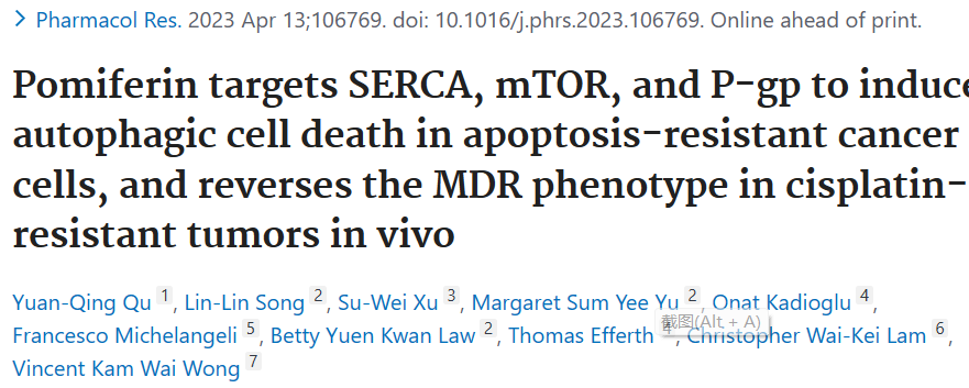 Yuan-Qing Qu et al. Pomiferin targets SERCA, mTOR, and P-gp to induce autophagic cell death in apoptosis-resistant cancer cells, and reverses the MDR phenotype in cisplatin-resistant tumors in vivo. Pharmacol Res. 2023 Apr 13;106769. doi: 10.1016/j.phrs.2023.106769.