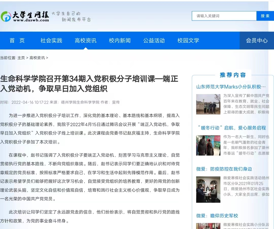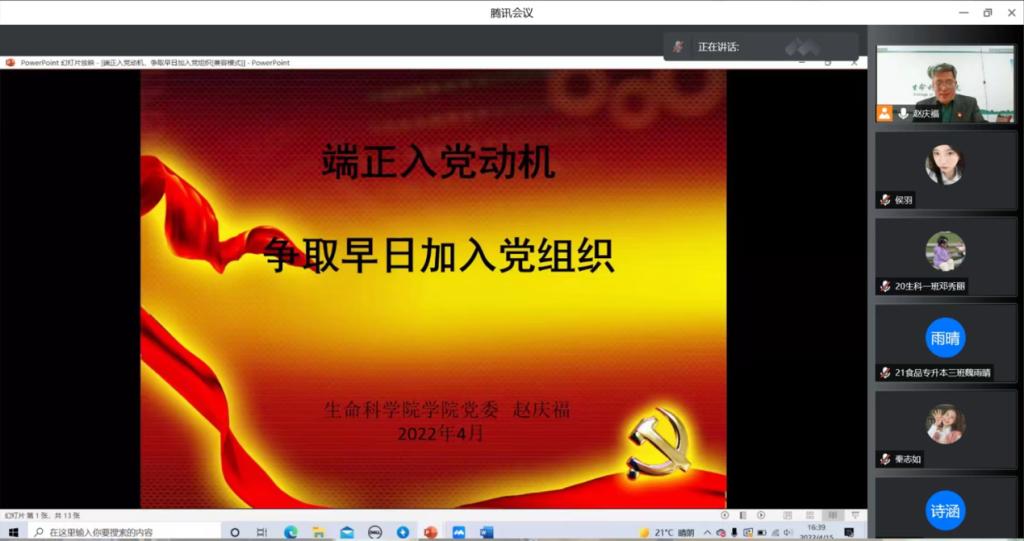 为进一步推进入党积极分子培训工作,深化党的基本理论、基本路线和基本纲领,提高入党积极分子的基础理论素养,我院于2022年4月15日通过腾讯会议开展“端正入党动机,争取早日加入党组织”入党积极分子线上培训课。此次课程由党委书记赵庆福主持,ok138cn太阳集团古天乐入党积极分子参加了本次培训。