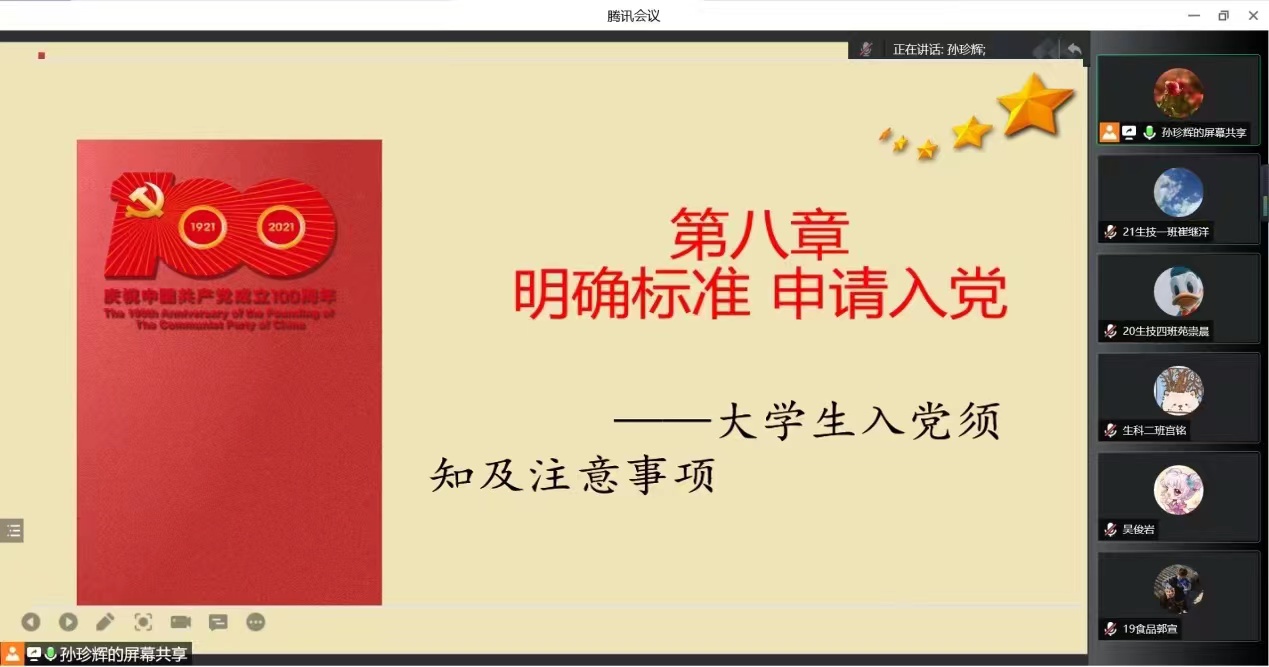 为提高入党积极分子们的党性修养,端正入党态度,明确入党动机。我院于2022年4月23日通过腾讯会议开展“明确标准,申请入党”入党积极分子线上培训课。此次课程由孙珍辉老师主持,ok138cn太阳集团古天乐入党积极分子参加了此次培训。