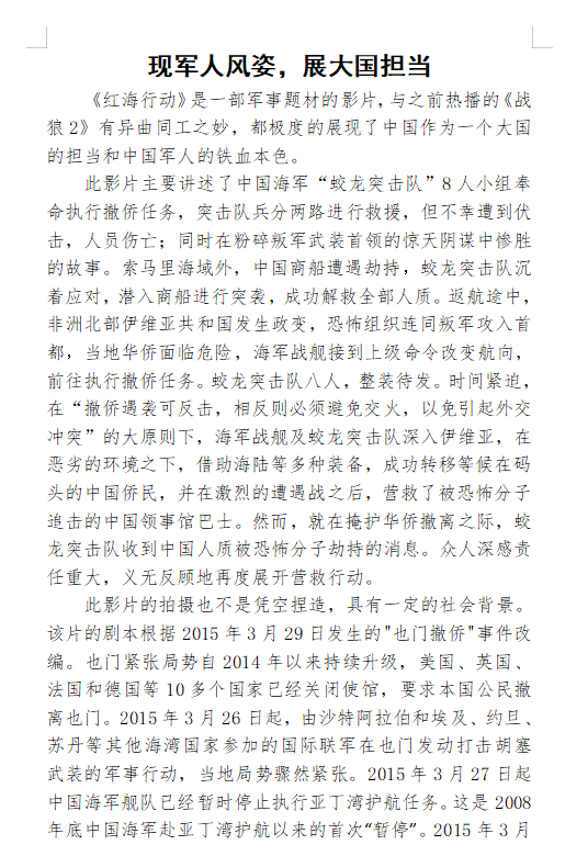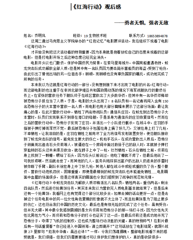 活动期间,同学们观看了《八佰》《红海行动》《空天猎》三部弘扬时代主旋律的优秀电影作品。影片放映开始前同学们便按耐不住焦急的心情早已在教室等待。观影过程中,同学们聚精会神,沉浸于历史长河中去找寻自己内心深处与祖国的情感共鸣。播放至高潮时,同学们潸然泪下。人肉炸弹不怕牺牲、视死如归的精神,蛟龙队员孤军奋战、不畏强暴的英勇,无不催人泪下,引起同学们共鸣。放映结束,全场迸发出雷鸣般的掌声。活动现场气氛融洽,秩序井然,离场时每人都还回味无穷。“骄傲”“感动”“震撼”......怀着无比激动的心情,同学们用笔尖书写下自己的真情实感。活动最后,经过评委打分以及令人紧张的网络评选后,ok138cn太阳集团古天乐乔明凤、林贵凯、徐硕淇同学分别取得了一等奖、二等奖、三等奖的优异成绩。