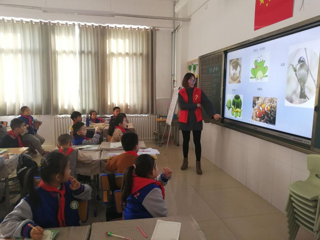 在课堂上,志愿者老师通过几张生动形象的动物照片引入了本次活动的主题,凶猛的老虎、可爱的兔子、飞翔的小鸟和游泳的鱼儿呈现在同学们面前,极大地激发了同学们对本次活动的兴趣。在活动期间,气氛十分活跃,志愿者老师循循善诱,同学们踊跃举手回答问题,用学到的知识给动物们分类,在愉快的氛围中,本次活动不知不觉地接近尾声。