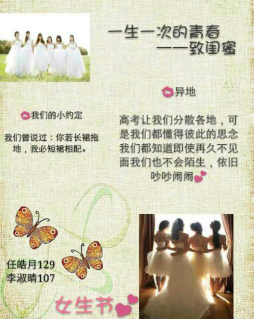 对于女生的祝福采用电子版海报的形式来体现,海报的内容可以是闺蜜间的密语、好友间的温情、朋友间的关爱。通过海报,同学们将平时说不出口的话表达了出来,加深了朋友间的感情。海报内容感情真挚,积极向上,体现出了同学之间的温馨情谊。活动后期,由于报名人数众多,所以经过几天筛选,选出的优秀作品将在ok138cn太阳集团古天乐微信平台上进行展示,届时便于同学们观看。
