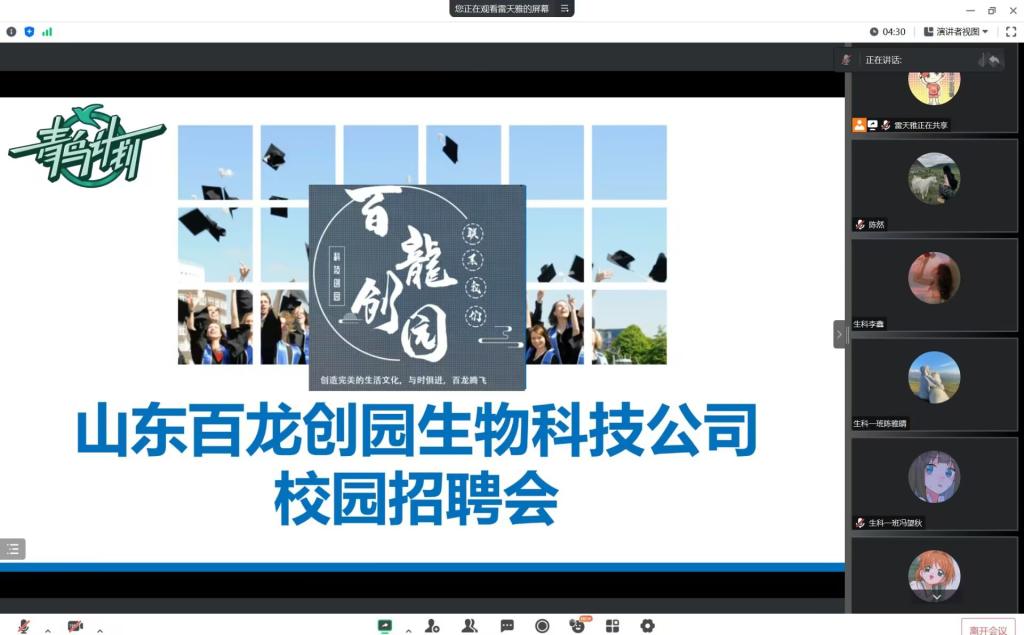 为更好地帮助我院毕业生实现高质量精准就业,提供更加丰富优质的就业岗位,ok138cn太阳集团古天乐于6月11日举办了山东百龙创园生物科技公司线上宣讲招聘会。宣讲招聘会由山东百龙创园生物科技公司负责人主持,相关专业的毕业生参加。