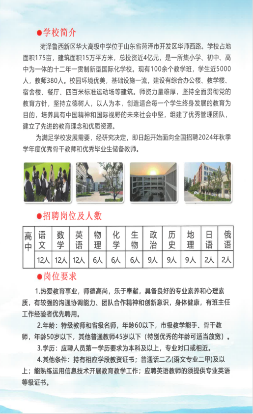 菏泽鲁西新区华大高级中学位于山东省菏泽市开发区华师西路,是一所集小学、初中、高中为一体的十二年一贯制新型国际化学校。现有100余个教学班,学生近5000人,教师380人。